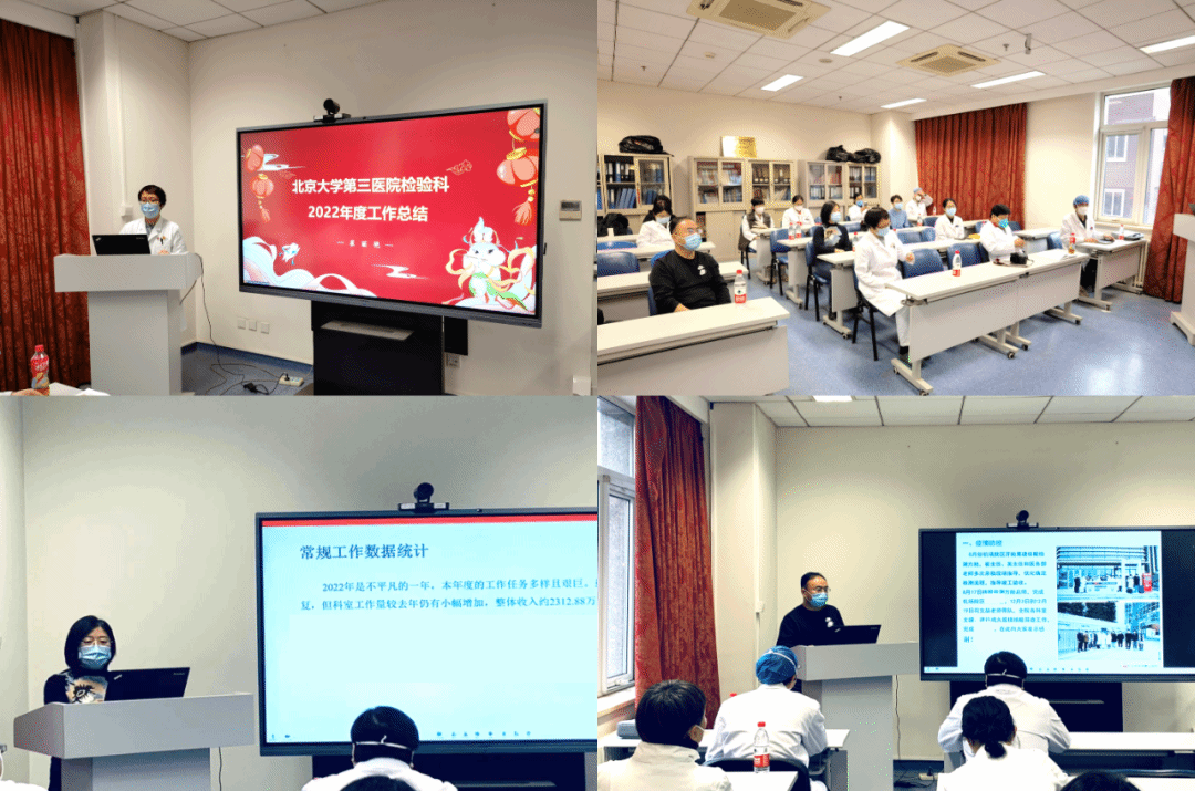 首先,崔丽艳主任从医疗、教学、科研、党团工会建设等方面对北京大学第三医院检验科工作进行了全面的总结。崔主任表示,2022年虽然受到疫情的影响,但各专业组工作量仍然持续增长。2022年检验科的工作重点是搭建高质量平台学科,提升临床服务能力,对标对表稳步推进检验科高质量发展。检验质量始终是检验科可持续发展的基石,在全科同事的齐心努力下,顺利通过了各项室间质量评价。同时,检验科在教学和科研工作中也取得了令人满意的成绩。党团工会组织了丰富多彩的活动,并于2022年成功获批“北京大学模范职工小家”。至今,检验科已陆续推出十九期“健康科普大讲堂”系列活动。今后,我科将继续采用多种宣传方式,争取科普宣传工作办得更有活力和新意。2023年检验科将在持续落实医疗质量的同时,着力加强人才培养和学科建设,期待在兔年我们携手并进,砥砺前行,满载收获。