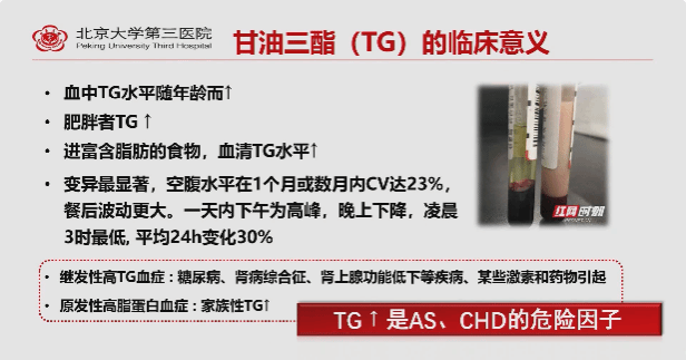 甘油三酯是与冠状动脉硬化和冠心病相关的危险因素,其水平随着年龄的增加而上升。当我们摄入高脂肪食物时,血清中的甘油三酯水平就会升高。根据中国成人血脂防治指南的划分标准,空腹,也就是禁食12个小时以上,甘油三酯在1.7mmol/L以下是适当的水平,在1.7-2.25mmol/L是边缘升高,如果大于等于2.26mmol/L属于甘油三酯升高。