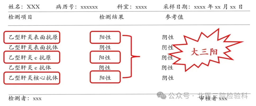 大三阳(HBsAg、HBeAg、HBcAb阳性):说明体内病毒活跃,传染性较强,可能病情较重,需要密切注意。