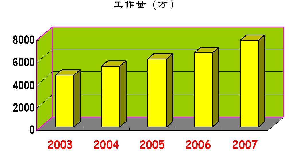 我科近5年,随着医院的发展,检验项目数量增多,同时检验工作量出现了大幅度的增高,以去年同期为基础,2004年增幅达到了28.6%,2005年增幅为13.5%,2006年增幅为10%,2007年增幅达到了16.5%。