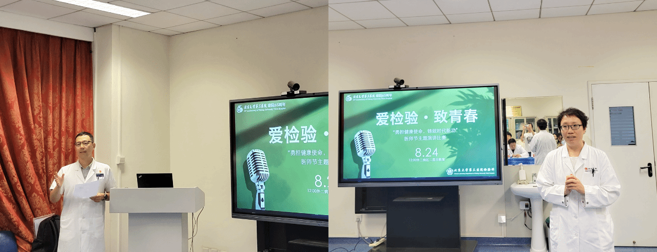 在第六届医师节来临之际,恰逢北京大学第三医院建院65周年,为了发扬我科职工锐意进取、奋发有为的工作作风,增强职业自信和自我认同感,弘扬青春正能量,凝聚检验家力量,2023年8月24日,检验科分工会举办“爱检验 致青春”医师节主题演讲比赛,为青年检验工作者搭建了一个展示自我的舞台。
