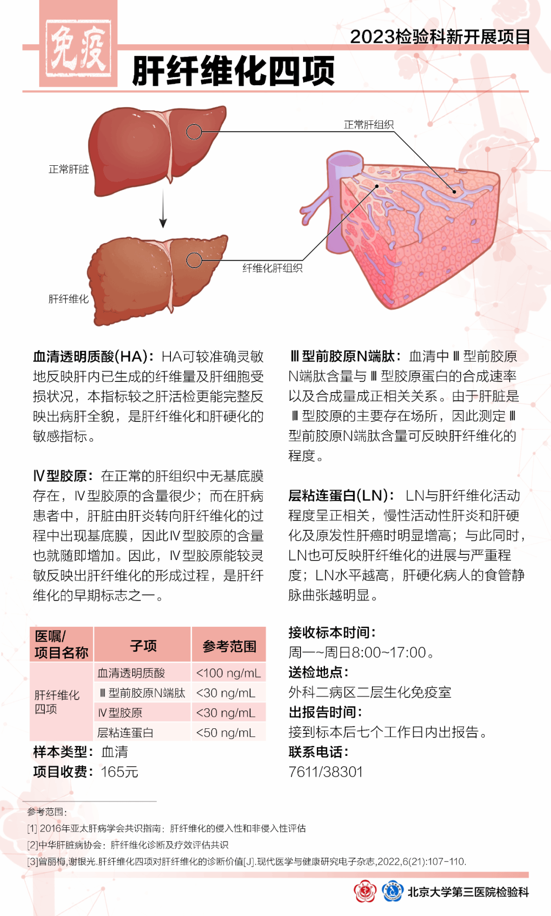 近期,检验科免疫组新开展项目“肝纤维化四项”,下图为详细介绍。