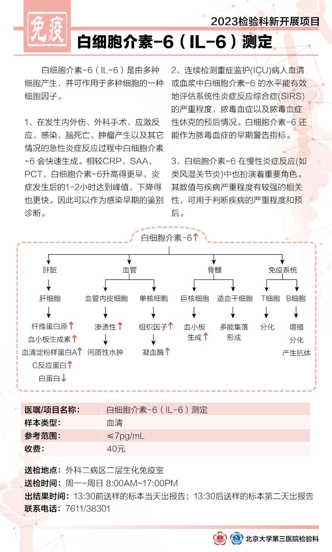 近期,检验科免疫组已新开展项目“白细胞介素-6(IL-6)测定”,下图为详细介绍。