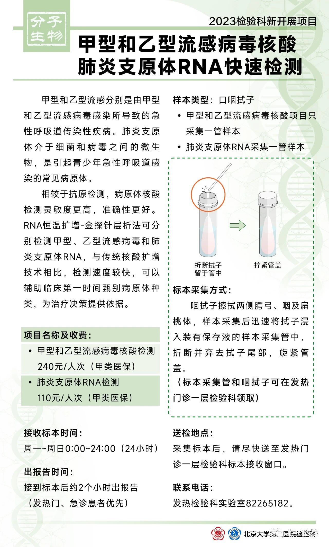 北医三院检验科已开展新项目“甲型和乙型流感病毒核酸”,“肺炎支原体RNA快速检测”,下图为详细介绍。