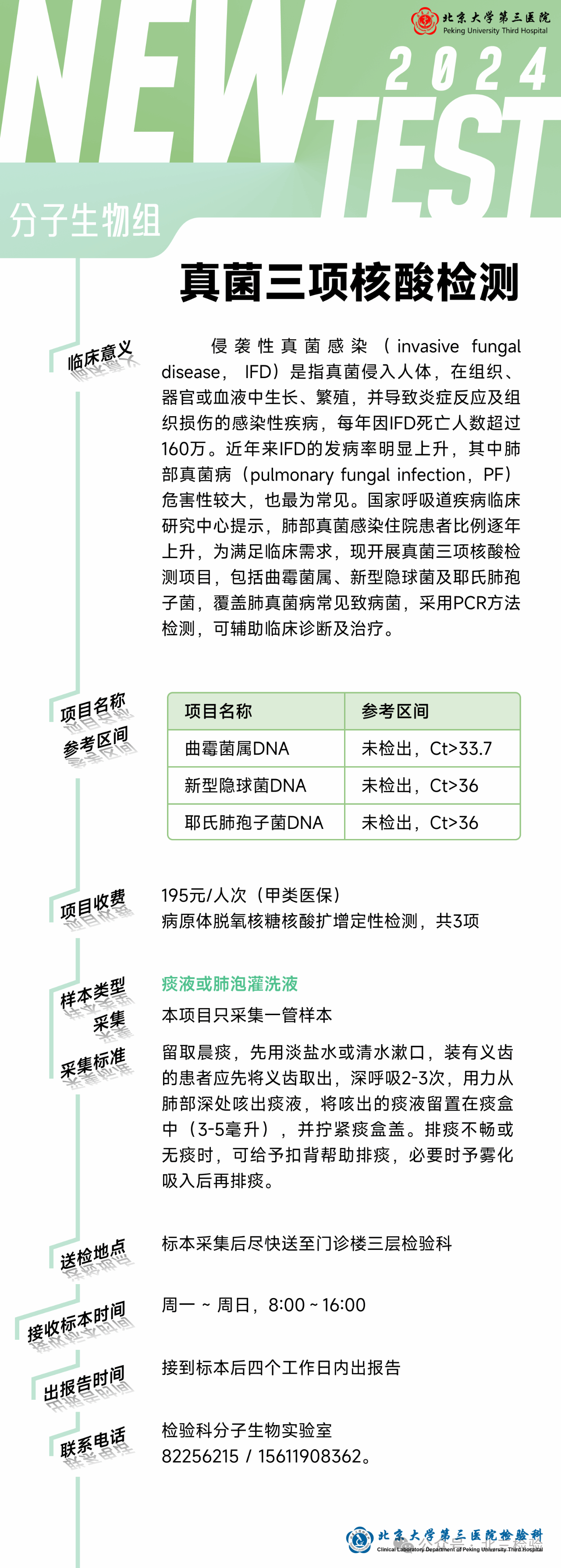 北医三院检验科已开展新项目“真菌三项核酸检测”,下图为详细介绍。