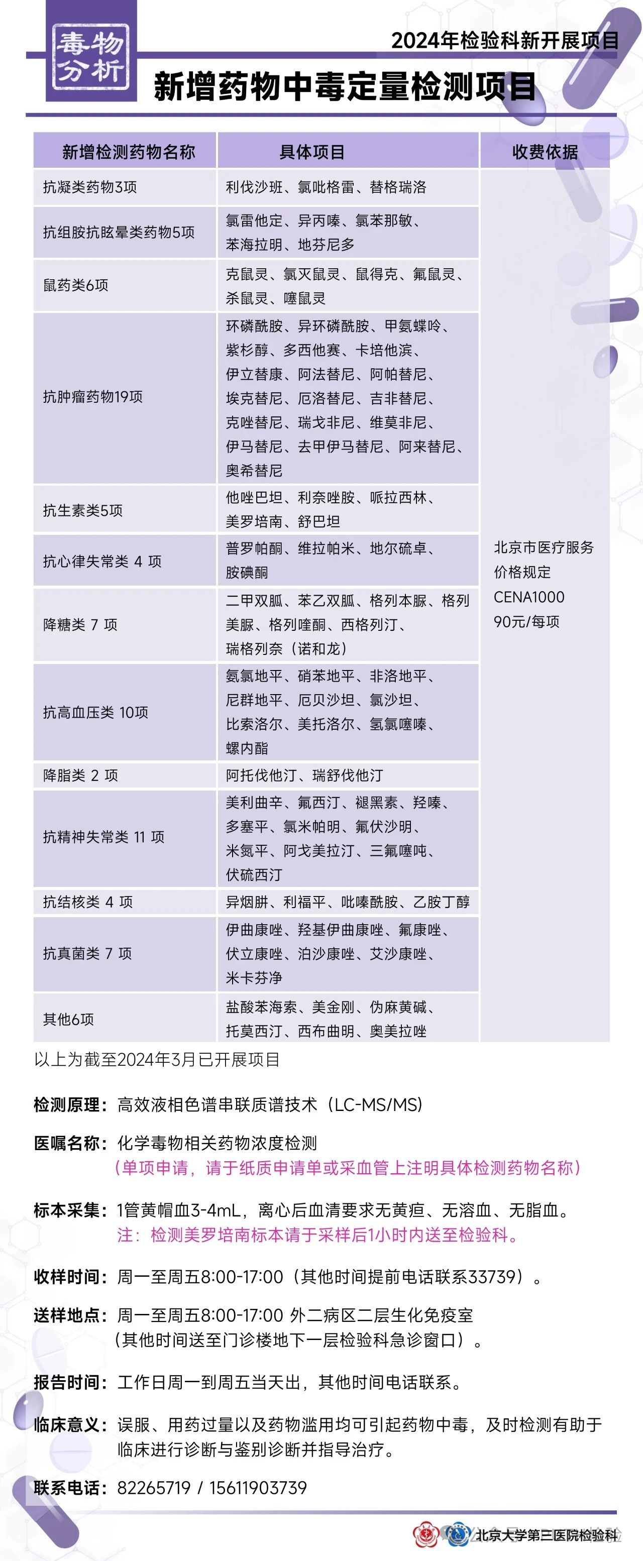 北医三院检验科已开展新项目:新增药物中毒定量检测项目,下图为详细介绍。