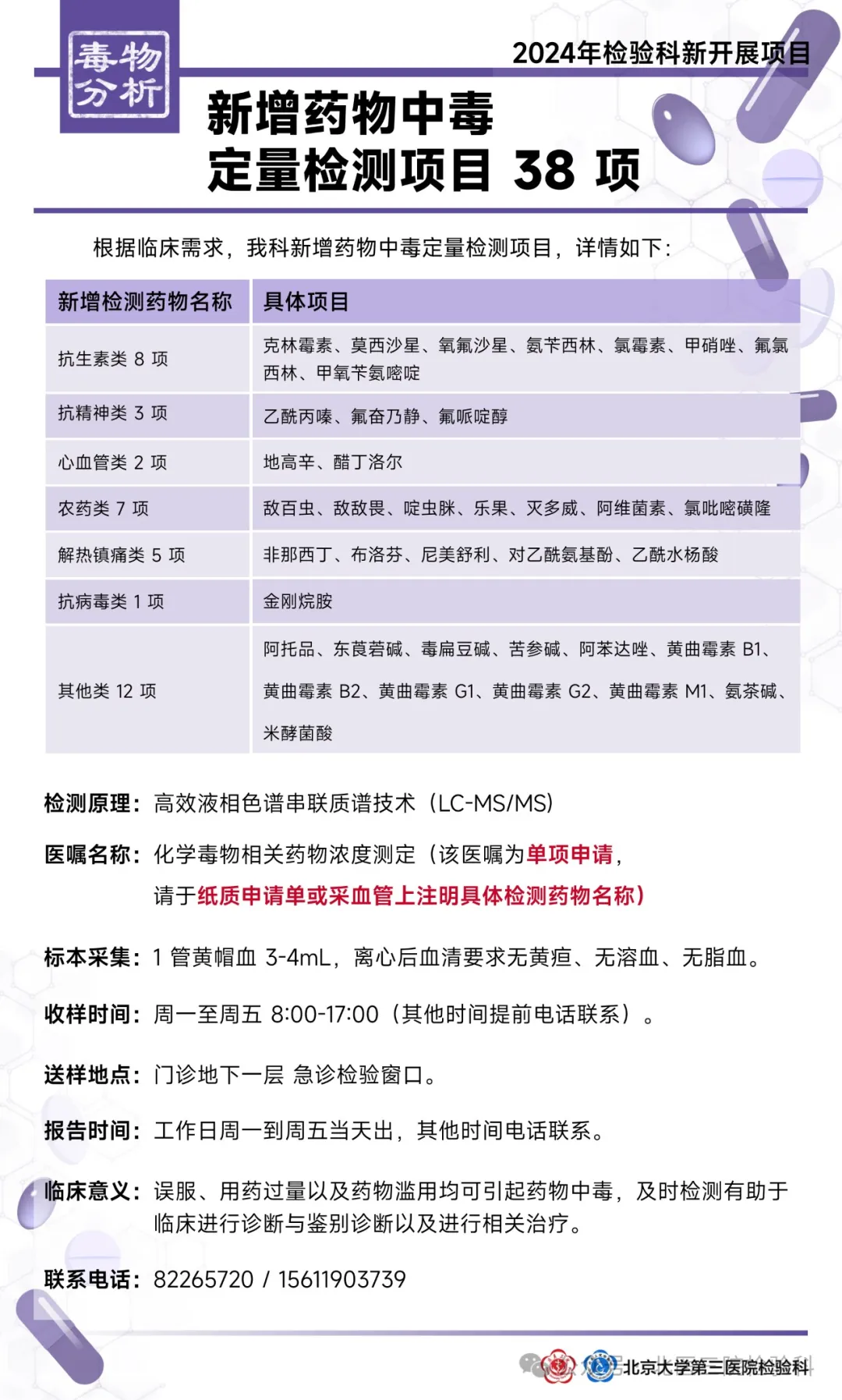 北医三院检验科已开展新项目:新增药物中毒定量检测项目38项,下图为详细介绍。