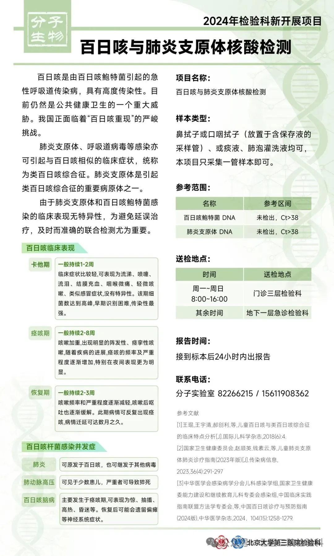 北医三院检验科已开展新项目:百日咳与肺炎支原体核酸检测,下图为详细介绍。