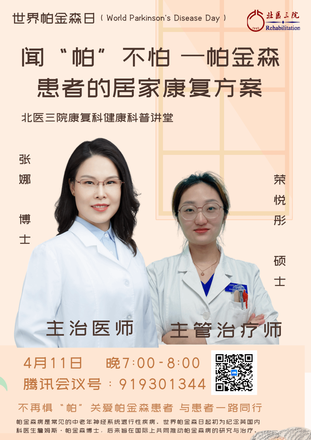 北医三院康复医学科将在4月11日(周二)晚7:00-8:00开展“闻“帕”不怕—帕金森患者的居家康复方案”健康讲堂活动。