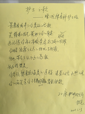 康复科的生活不同于其他临床科室,除了常规的诊疗、规范化的治疗之外,更多的时间里,护士需要开解患者,点燃那盏康复路上的小灯,照亮那个开满鲜花的伊甸园。康复治疗的周期相对较长,功能训练过程相对枯燥乏味,但是不论苦涩或是泪水,笑容还是惊喜,一路走来,一同携手,攻占病魔,把握健康!而当患者带着笑容重新回归家庭,回归生活,回归社会的时候,一首娟丽富含感情的小诗翩然而至,那一刻,洋溢在康复科每位护士脸上的笑容就是这春日里最灿烂的花朵!