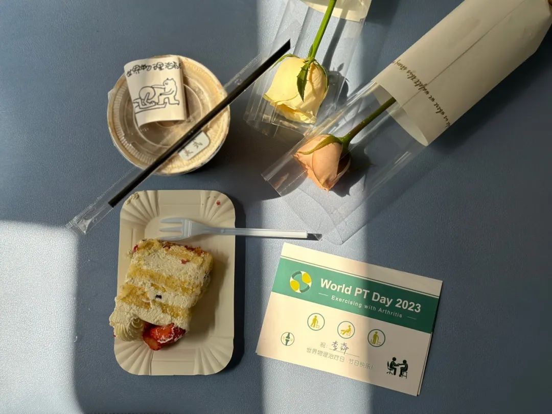 活动现场由郑旭园、刘茜瑶和茹子逍等小伙伴精心布置,美味的蛋糕、手写的祝福卡、多彩的鲜花以及生动展示物理治疗场景的手绘贴纸一张张贴在每杯饮品上,仪式感和氛围感十足。