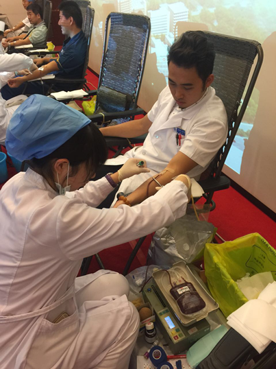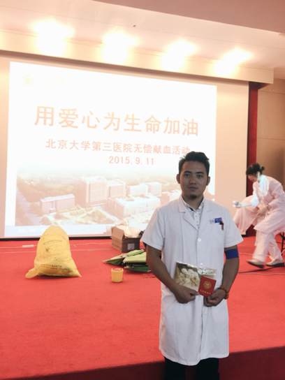 2015年9月11日,北医三院组织院内职工无偿献血活动,本次献血活动的主题是《用爱心为生命加油》。许多科室护士长、工会组长陪同为献血人员服务,一些科室领导也亲临献血现场关心员工,并为员工打气加油。献血现场,医院为献血者提供了早餐和慰问品,我科康复治疗师雷超,代表康复科全体人员,在护士长的陪同下参加了此次的献血活动。