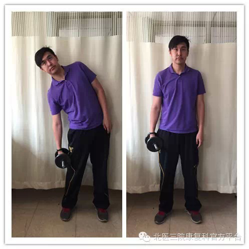 3.抗阻侧屈:站立位,手握哑铃,手臂自然下垂放于体侧,先缓慢有控制地侧弯向握哑铃一侧,再缓慢用力,使上身恢复至正直的中立位,左右两侧均应练习。于最用力位置保持5-10秒/次,10次/组,练习2组。