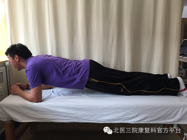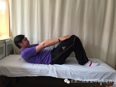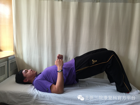 1.“双桥”练习:仰卧位,双腿屈曲,双脚平放床上,用力蹬起,使臀部离开床面,尽量挺直身体,并保持平衡。不可挺肚,塌腰。本练习亦称“五点支撑”,随着肌力的加强,可以做“四点支撑”,即只依靠腰腹、手臂和下肢肌力支撑体重,颈部不再用力。于最用力位置保持5-10秒/次,10次/组,练习2组。