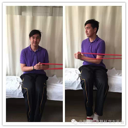 4. 坐位转体:坐位,上体正直,双手在胸前握住一橡皮筋,抗皮筋阻力向一侧转体拉紧皮筋。注意必须是使用腰部力量,而不能用手臂力量牵拉皮筋,双上肢只起固定皮筋的作用,不参与旋转的动作。于最用力位置保持5-10秒/次,10次/组,练习2组。