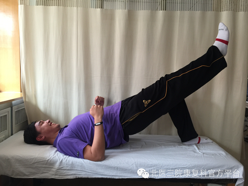 1.仰卧举腿:仰卧位,双腿并拢,同时抬起保持直腿伸直。通过抬腿的高度控制强度(抬腿越高强度越小)。腰部不离开床面。于最用力位置保持5-10秒/次,10次/组,练习2组。