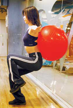 如果再想增加难度,可以不去靠墙,而是在墙和背部之间靠一个健身球,也就是靠在健身球上做“靠球静蹲”,这样就可以增加难度。因为健身球是有弹性的,你要控制力量的大小不能单纯只是使劲向后靠,而且球还会滚动,就更要求控制用力的方向和左右腿之间力量的分配,不能让球滚下来。