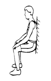 上身正直抬头挺胸,保持身体直立,两脚分开和自己肩宽一样的距离,脚尖正向前,不要“外八字”或者“内八字”。背靠墙壁站好,脚跟大约离开墙壁一脚长的距离。体重平均分配在两条腿上,缓慢地下蹲,到大腿小腿呈90°角为止。保持这个角度,然后逐渐把脚向前移动,这时候低头看一下,膝盖和脚尖正好在一条直线上,换句话说,就是从上往下看,膝盖正好挡住脚尖。现在的姿势就是标准的“靠墙静蹲”的姿势了。