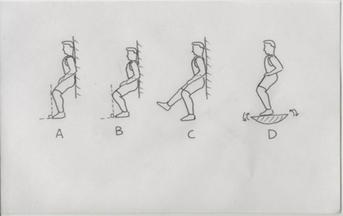 以上描述的是标准的“靠墙静蹲”动作。还可以根据不同需要把这个动作演化成多种练习方法。