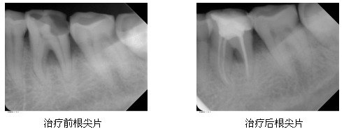 以下是一名52岁的女性患者左下后牙根管治疗的病例,患者因左下后牙自发痛3天,冷热刺激加剧前来就诊,经临床检查确诊为左下第一磨牙龋齿引起的急性牙髓炎,需做根管治疗。因患者年龄较大,根管存在钙化,而且牙根形态弯曲,治疗难度较大,经过仔细探察,运用先进的仪器设备,做到完善根充,治疗效果理想,症状完全消失。治疗前后根尖片见图。