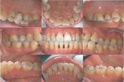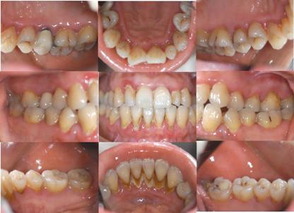 口腔卫生状况:极差;大量菌斑、软垢,龈下牙石、色素(+++)