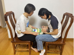 2岁以下孩子刷牙主要靠家长来完成,这时候孩子不能配合刷牙,我们得采用一个舒适而科学的姿势来帮助他们刷。推荐使用膝对膝的体位,即两位家长相对而坐,膝盖对膝盖帮孩子刷牙。孩子的头平躺于一位家长腿上,双腿分开置于另一位家长的身体两侧,这位家长用双手辅助固定住孩子的腿部,如下图: