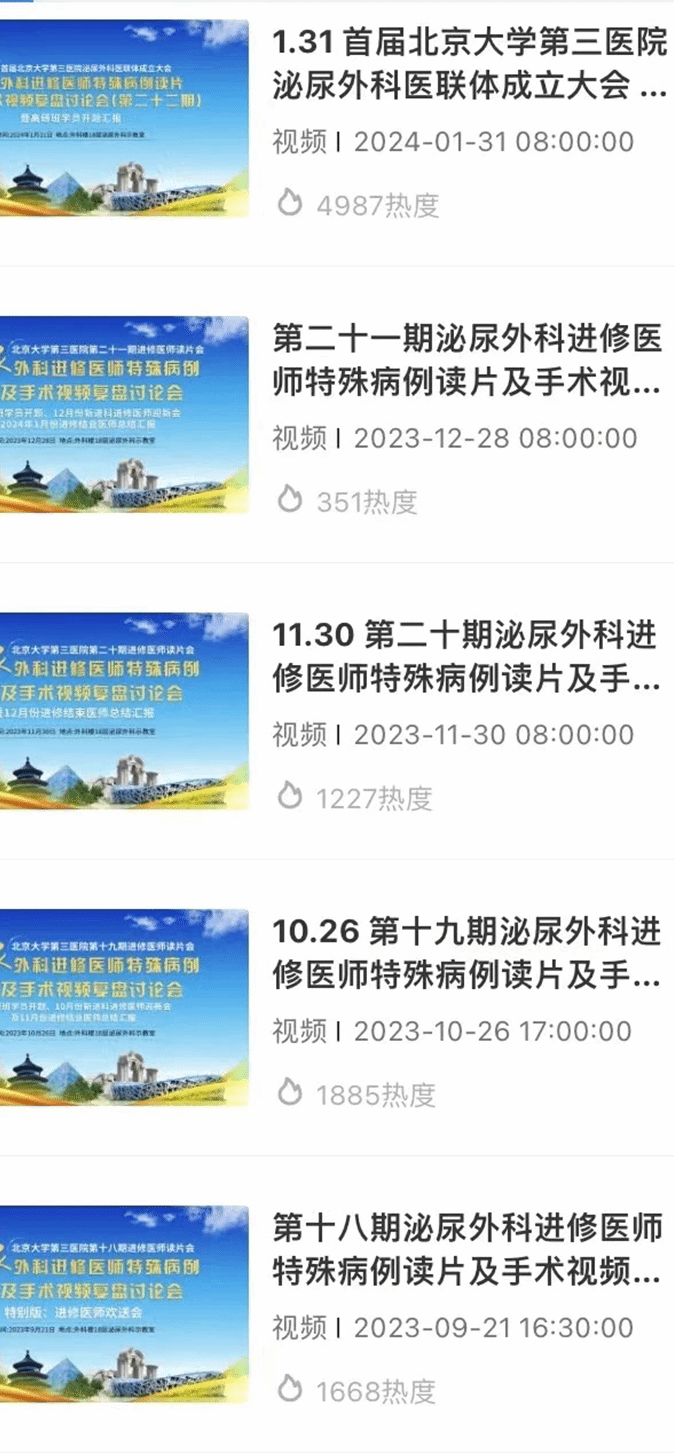 (2) 临床技能: 专科培训形式(肿瘤、结石、微创、移植等)。经过培训,可作为第一助手参与手术(具备执业医师资格,执业地点必须转至我院,提前与原单位确认),并在高年资医师指导下,完成各亚专业手术核心步骤(包括但不限于:肾癌根治术、肾部分切除术、肾上腺肿瘤切除术、前列腺钬激光剜除术、经皮肾镜通道建立及碎石术、输尿管软镜钬激光碎石术等。)每月最后一周的周五组织进修医师读片及手术复盘会,每次均进行全网直播,目前已成功举办17期,且已成为全国泌尿外科界进修医师培训的品牌活动;不定期组织腹腔镜或手术机器人动物实战培训。