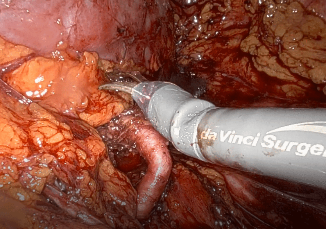 同种异体肾移植是治疗终末期肾病的最佳方法。本例手术中的供肾者是一个59岁女性,自愿捐献肾脏给亲属进行移植。术前影像学检查腹部CT提示该供肾者具有左侧双支肾动脉,其中1支极支动脉位于肾下极。虽然解剖结构变异给手术带来一定挑战,但侯小飞主任最终精彩地完成了我院首例机器人辅助经腹腔左侧活体供肾切取术。通过达芬奇手术机器人的清晰视野、精细解剖和精准操作,缩短了手术时间、降低了出血量和并发症风险。