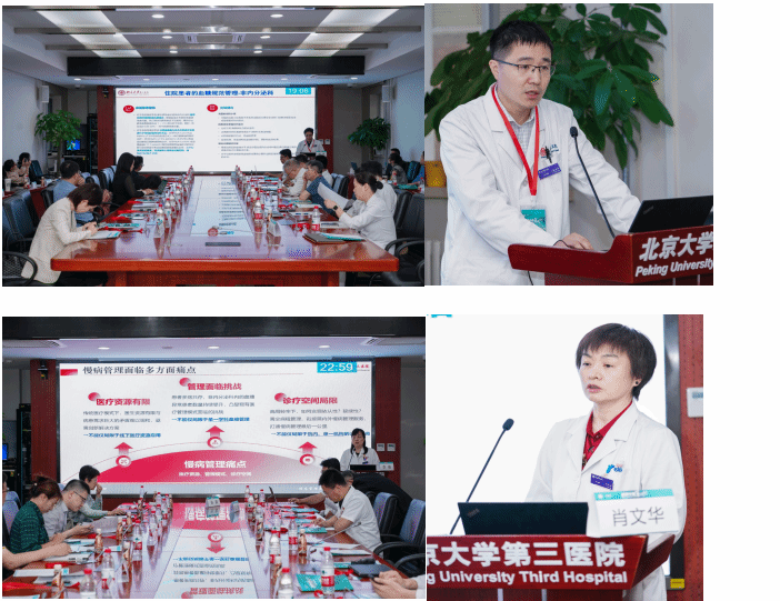 内分泌科医疗副主任杨进介绍了北医三院糖尿病规范诊疗与院内多学科血糖管理,重点介绍了全院智慧血糖管理、北方院区糖尿病一站式诊疗中心工作的内容。医务处副处长徐昕晔介绍了紧密型医联体模式下的糖尿病区域性分级诊疗和综合管理。信息管理与大数据中心党支部书记李维介绍了数智技术助力糖尿病慢病全程管理的工作。大内科副主任肖文华教授介绍了亚洲人群糖尿病管理策略以及中国糖尿病患者药物治疗的进展。