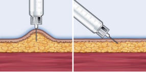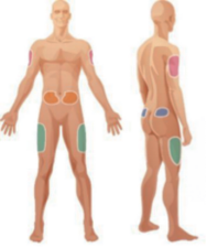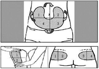 除了选择不同的注射部位,同一部位间又该如何进行轮换呢?首先我们将注射部位分为四个等分区域(大腿或臀部可等分为两个等分区域),每周使用一个等分区域并始终按顺时针方向轮换。同时,在任何一个等分区域内注射时,连续两次注射应至少间隔1cm(或大约一个成人手指的宽度),以免重复的组织创伤。