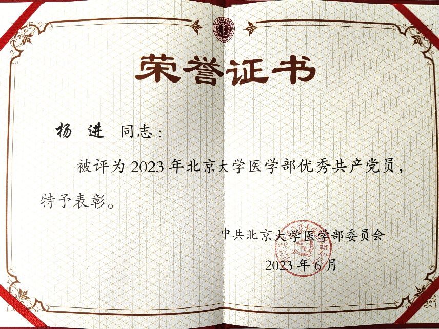 杨进同志被评为2023年北京大学医学部优秀共产党员