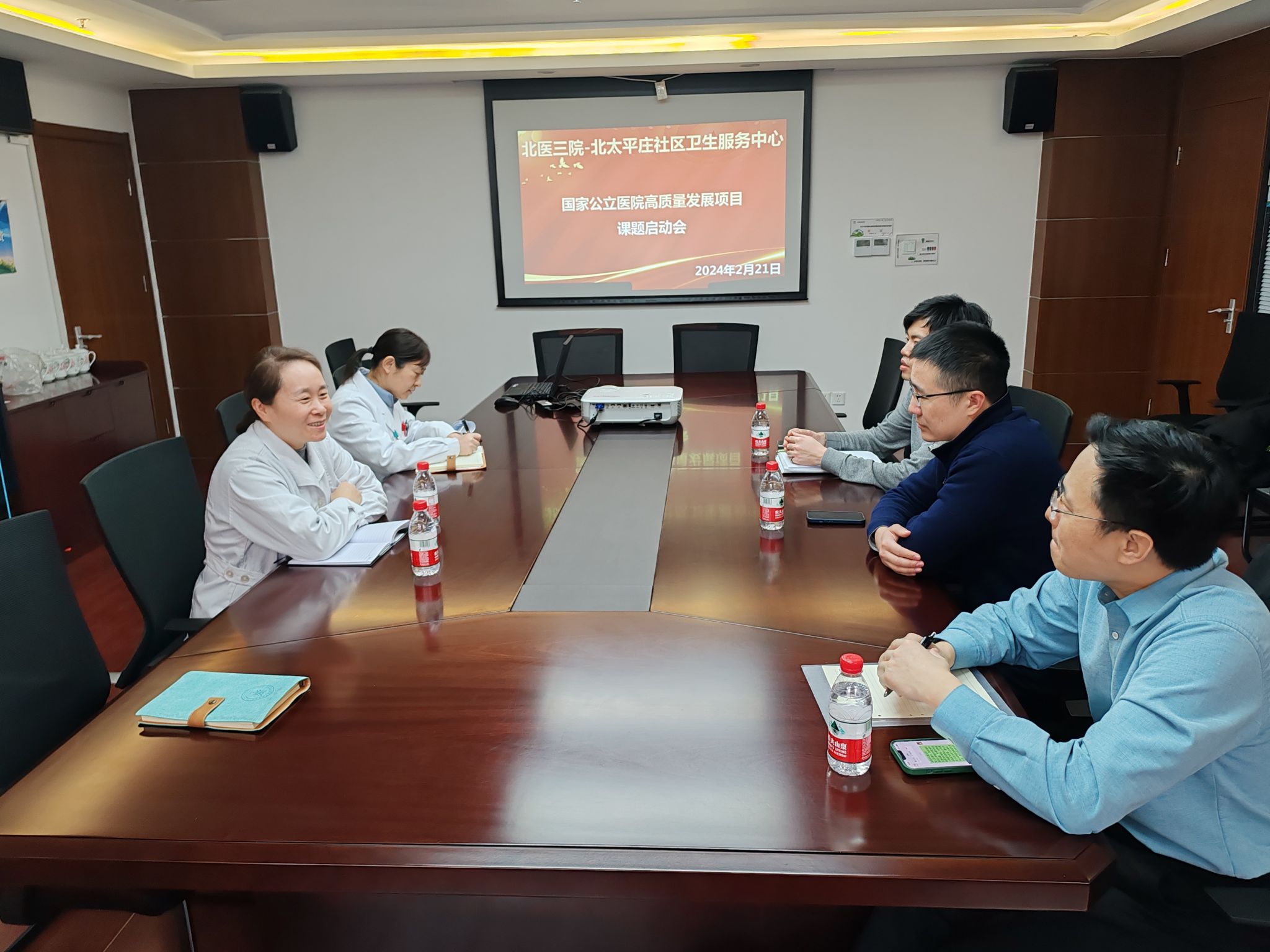 2024年2月21日下午,北医三院医务处、内分泌科相关领导和专家到北太平庄社区卫生服务中心,进行海淀区公立医院改革和高质量发展示范项目介绍和合作座谈会,医务处徐昕晔副处长、内分泌科杨进副主任代表职能部门和临床科室进行了项目背景介绍和工作计划汇报,并与社区卫生服务中心各位领导专家进行了深入沟通。