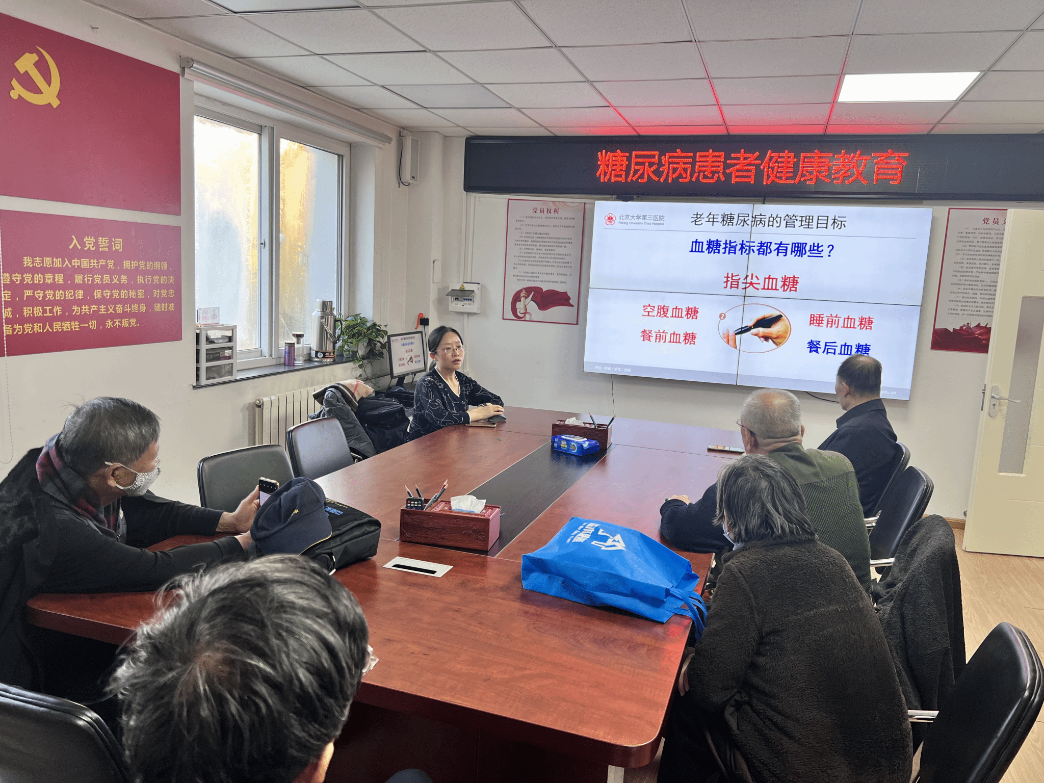25日下午,北京大学第三医院内分泌科杨进副主任医师和张文慧副主任护师在中关村社区卫生服务中心出诊及患教,促进优质医疗资源下沉进社区,获得患者好评。门诊后杨进副主任医师与全科医学科多位医师进行“面对面”Workshop,讲解了糖尿病患者血脂管理和动态血糖的应用。张文慧副主任护师开展“老年人群如何管理糖尿病”的患者教育课,社区全科医学科的医师们也进行了患者教育授课,并对老年患者们的问题一一解答。中关村社区卫生服务中心主任马长瑛等领导、全科医学科医护人员等参加活动。