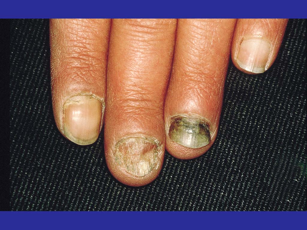 医师徐敏丽说,“这类病变是甲板里面的皮肤产生的病变,如起红疹子、脱皮等,透过指甲表现出来,而指甲本身并没有改变。”