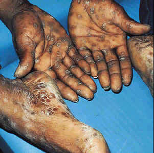 二期梅毒:一般在感染后7-10周也可半年后出现二期梅毒的表现。早期症状为流感样综合征、全身淋巴结肿大,随之出现皮肤粘膜疹为主的临床表现。梅毒皮疹呈多种多样,可类似许多皮肤病,其皮损总的特点为缺乏自觉症状或症状轻微,皮疹泛发对称,常累及掌跖。一般皮疹主要为全身对称性广泛分布的红色斑疹,呈卵圆形,大似黄豆,互不融合,可于数日或数周内消褪。另外皮疹可呈紫铜色丘疹,又名丘疹型梅毒疹。丘疹质坚硬,皮疹泛发全身,密集分布,互不融合,数周后可消祖。若丘疹中心坏死可形成脓疮,即脓疮型梅毒疹,其损害数目少。在抵抗力差的患者可出现2-3cm大的脓疱,表面可堆积厚痴如牡领壳样,又称牡领壳样梅毒疹。也有皮疹呈典型毛囊性丘疹,聚集成簇,散发于躯干,称毛囊丘疹型梅毒疹。也可呈雅司样疹及溃疡疹。其中掌部鳞屑性环形梅毒疹较多见。也可见到额部海毒性色素沉着班及头部虫蛀样脱发。粘膜损害有稍隆起的圆形或椭圆形丘疹,表面糜烂或溃疡,上有灰白色薄膜,好发于唇、扁桃体、舌、软聘等口腔部位。此外,有好发于肛门或外生殖器潮湿部位的扁平大片融合性渗出性丘疹,称为扁平湿疣。