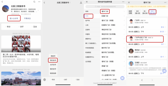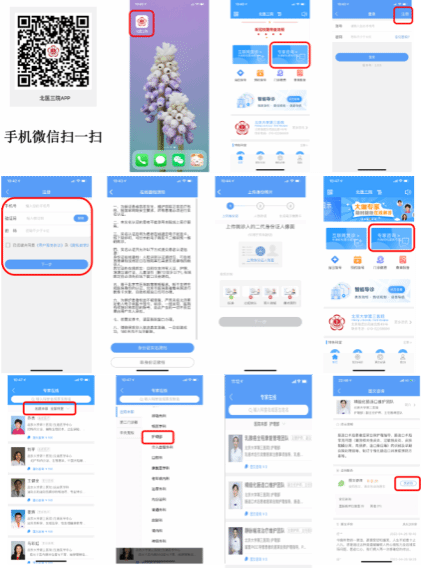 微信关注北医三院服务号关联个人就医信息导诊预约挂号外科普外门诊周三造口专业。每周日早七点钟开放号源,具体操作流程图示如下。