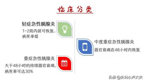 急性胰腺炎;临床上分为轻症急性胰腺炎、中度重症急性胰腺炎、重度急性胰腺炎。