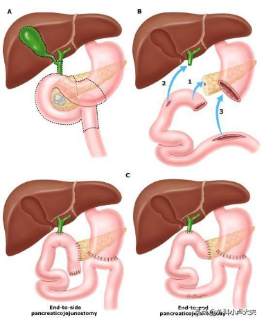 l 肿瘤位于胰头或者钩突,需行胰十二指肠切除术,切除部分胃、十二指肠、胰头、部分空肠、部分胆管、胆囊六个器官,做三套重建,包括胰肠吻合、胆肠吻合、胃肠吻合!