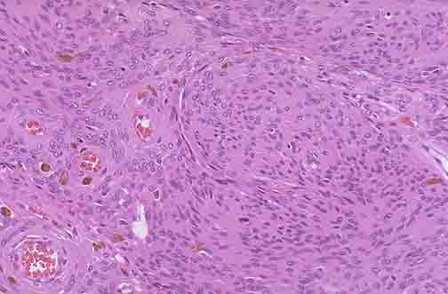 脊膜瘤由脊膜上长出,有完整的包膜,呈粉红色,大多数长2~3cm间,少数肿瘤可长达6~7cm,横径2~3cm,成为巨型脊膜瘤,后者一般位于马尾部位。瘤蒂几乎都与硬脊膜和蛛网膜粘着。少数起源于脊髓纵裂内的软脊膜,成为软脊膜下肿瘤。瘤与神经根的关系多不密切,但个别较小的肿瘤也可与1~2神经根粘着,不易分离。显微镜下,肿瘤可有多种类型,内皮型最多,占56%;纤维型其次,占28%;砂粒型较少,占15%;其他型8%;恶性6%。
