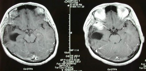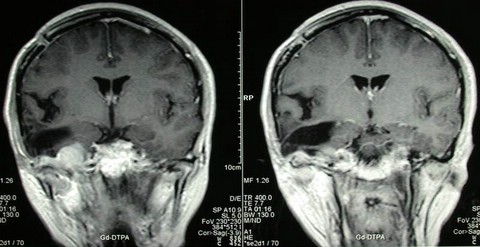女性,29岁,主因头痛恶心呕吐1个月入院。查MRI示:右侧中颅底巨大脑膜瘤。