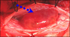 术中见肿瘤位于脊髓腹侧偏左,和颈8神经根关系密切,肿瘤有囊性变,血运中,分块全切肿瘤。