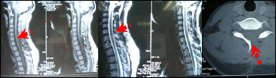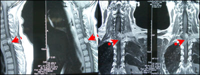 女性,30岁,胸背部疼痛2月半。入院查体:左侧霍夫曼征阳性,余无阳性体征。
