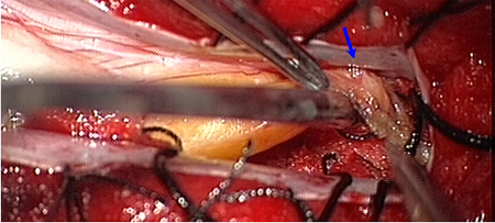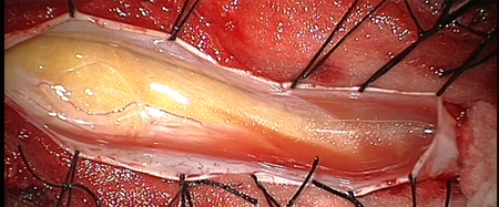 术中见脂肪瘤性病变源于脊髓圆锥,终于末端终丝,脊髓有牵张、拴系表现。肿瘤下极部分切除后,剪断远端终丝。