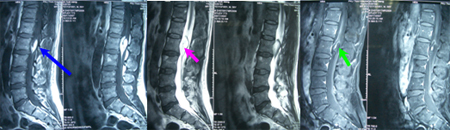 男性,56岁,左下肢无力8年,加重伴二便功能障碍1年。查体:双下肢肌萎缩,左下肢近端3级、远端0级,右下肢近端4级、远端3级,双侧膝腱、跟腱反射减弱,肛门外括约肌松弛,双侧病理征阴性。术前图片显示:肿瘤位于L2水平,呈蝌蚪状,短T1、长T2信号,压脂像脂肪明显抑制,未见强化表现。