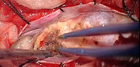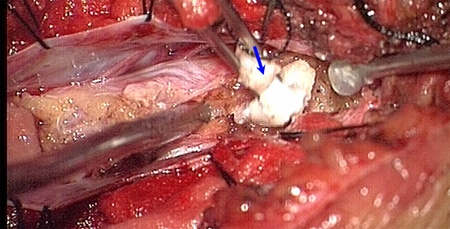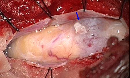 术中发现L4-5椎板异常增生肥厚,L5椎板伸入椎管内形成骨嵴,脊髓圆锥低位在L4水平,L4以下肿瘤组织为多种成份,近端为脂肪组织,S1水平分为两种肿瘤成份,内侧为清亮粘液状物、外侧为珍珠样角化物。