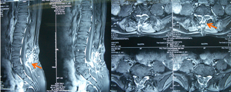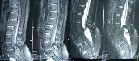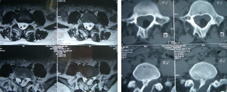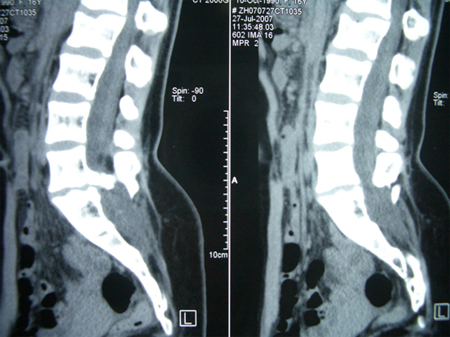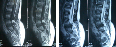 女性,17岁,劳累后腰部疼痛3年。入院查体:神情语利,卧位,双眼活动充分、双瞳等约2.0mm、光反射灵敏,面纹称,伸舌中,颈抵抗(-)。四肢可自主活动,鞍区针刺痛觉减退。B超:膀胱残余尿量10ml。术前图片: