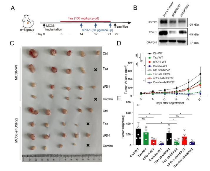 该研究发现,在结直肠癌中,EZH2可通过泛素-蛋白酶体系统增强PD-L1在蛋白水平的稳定性,抑制EZH2活性可通过经典组蛋白H3K27me3方式,转录激活去泛素化酶USP22表达,并进而增强USP22介导的PD-L1的去泛素化,从而延长PD-L1蛋白半衰期并增强其稳定性。EZH2抑制剂可抑制结肠癌抗肿瘤免疫,增加Treg趋化和TIM-3+ 晚期耗竭CD8+细胞毒性T细胞浸润,敲减肿瘤USP22可降低结肠癌PD-L1表达,改善肿瘤免疫微环境并增强EZH2抑制剂Taz治疗的敏感性。该联合团队通过对公共数据库的挖掘,证实USP22可作为结肠癌患者预后预测因素,并可预测患者肿瘤免疫浸润状态。该研究对PD-L1的内在调控机制进行了完善补充,首次发现EZH2介导的肿瘤表观遗传对PD-L1存在蛋白水平调控,鉴定并验证出介导这一效应的EZH2新靶点USP22。该研究探索了表观遗传与免疫治疗发挥协同抗肿瘤效应的可能性,为表观遗传药物及免疫治疗的临床应用拓展及联合应用提供了新的支持证据。