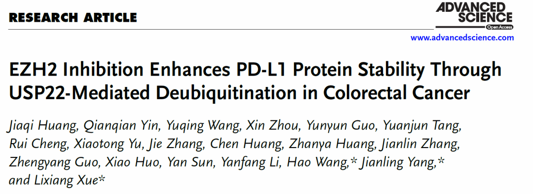 近日,北京大学第三医院医学创新研究院基础医学研究中心联合普外科、肿瘤放疗科等多科室在Advanced Science发表了题为“EZH2 Inhibition Enhances PD-L1 Protein Stability Through USP22-Mediated Deubiquitination in Colorectal Cancer”的研究论文,揭示了EZH2抑制剂通过表观遗传方式上调去泛素酶USP22表达,增强结肠癌PD-L1蛋白稳定性并与免疫治疗发挥协同抗肿瘤效应的内在机制。