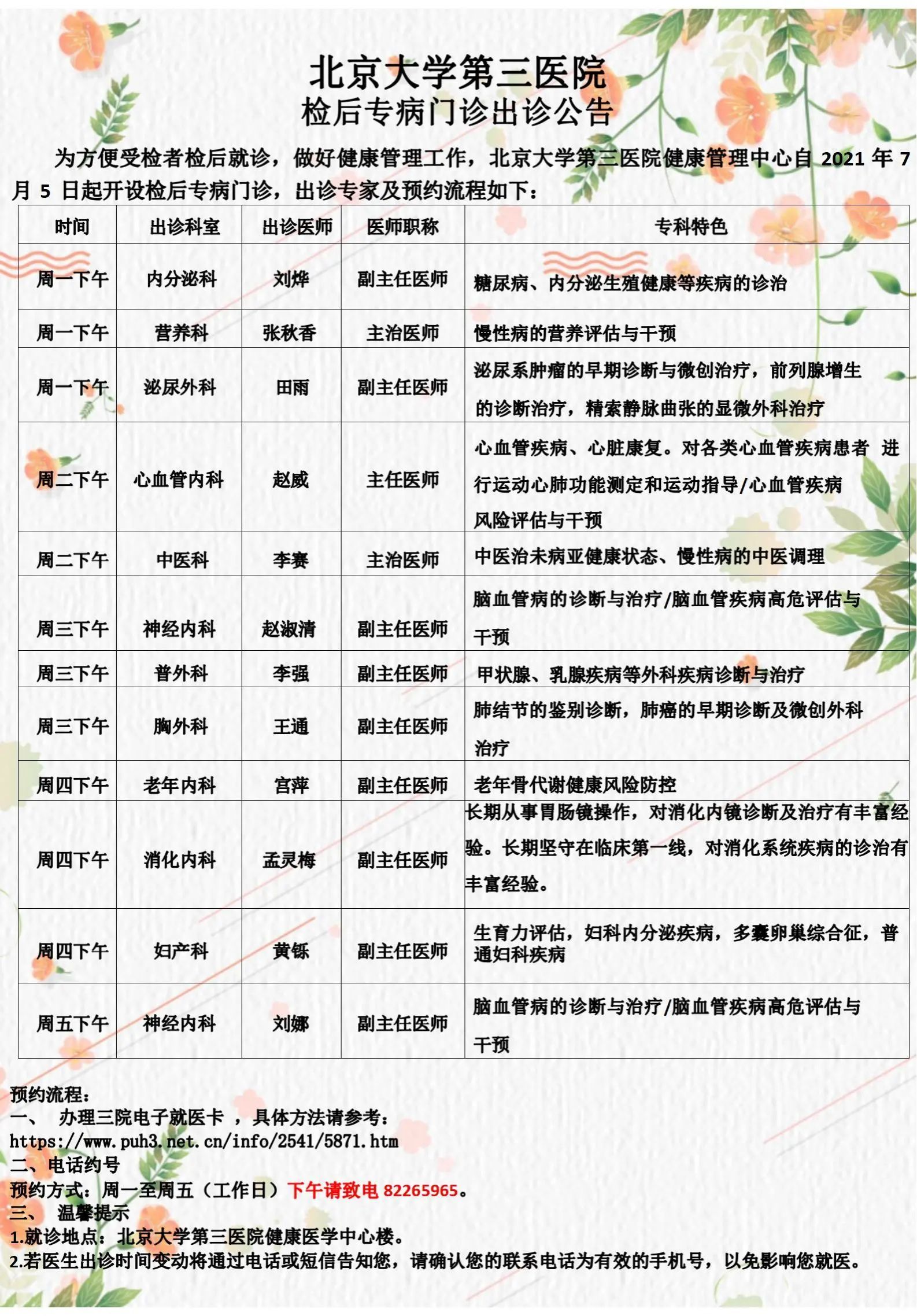 为方便受检者检后就诊,做好健康管理工作,北京大学第三医院健康管理中心与内分泌科、营养科、神经内科、心血管内科、普通外科、老年内科、妇产科、消化内科、中医科等临床重点专科联动联通,率先开设检后专病门诊。