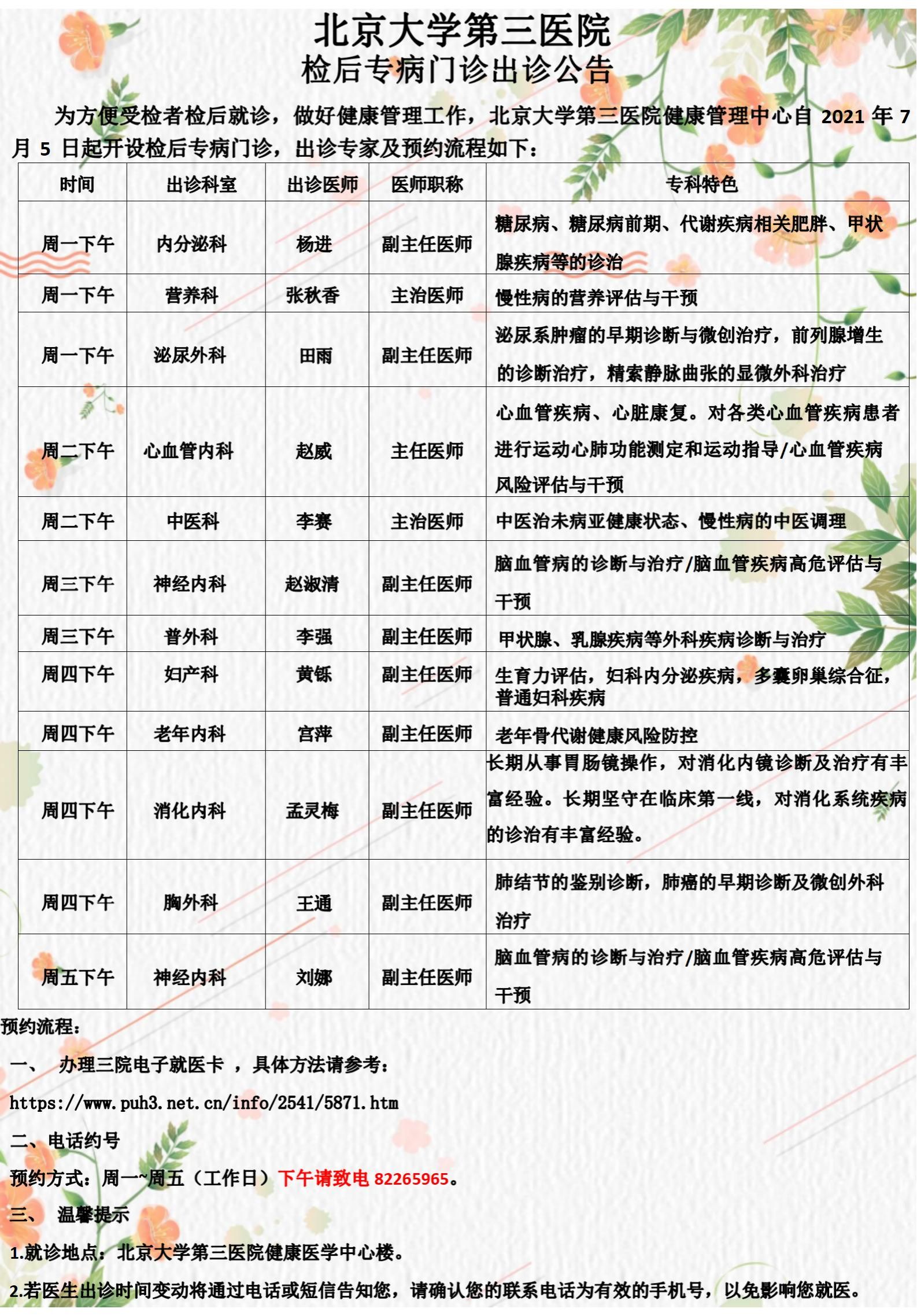 为方便受检者检后就诊,做好健康管理工作,北京大学第三医院健康管理中心与内分泌科、营养科、神经内科、心血管内科、普通外科、老年内科、妇产科、消化内科、中医科等临床重点专科联动联通,率先开设检后专病门诊。